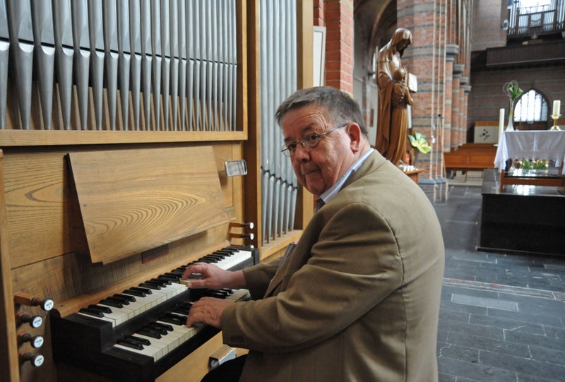Miel Erpelinck aan het kleine pijporgel. Op de achtergrond het beeld van Sint Anna en haar dochter H.Maria.